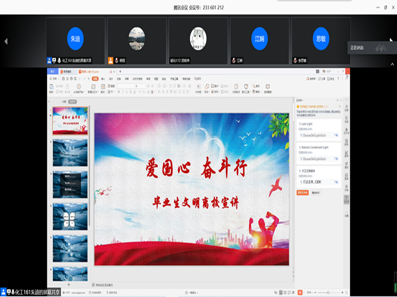 學(xué)院精心為每位畢業(yè)生制作畢業(yè)紀(jì)念優(yōu)盤,表達(dá)學(xué)院對畢業(yè)生的殷殷期盼,望石化學(xué)子奔涌前行;畢業(yè)學(xué)子創(chuàng)作畢業(yè)歌曲《化說再見》,記錄別樣青春時光;畢業(yè)典禮嚴(yán)肅活潑,讓畢業(yè)生擁有難忘且珍貴的記憶;考研宿舍感恩活動傳遞正能量,難忘宿管阿姨、食堂阿姨的關(guān)懷照顧;畢業(yè)班會憶往昔話今朝,師生情深,不說再見;考研學(xué)霸班級勵志成長,激勵石化學(xué)子乘風(fēng)破浪;“青年講師團(tuán)”畢業(yè)文明離校宣講活動,傳遞愛國情,砥礪奮斗行;誠信教育線上活動,學(xué)生感恩資助,自立自強(qiáng);畢業(yè)班黨員學(xué)習(xí)經(jīng)驗(yàn)分享,不忘初心,揚(yáng)帆遠(yuǎn)航;考研經(jīng)驗(yàn)交流,站在學(xué)長學(xué)姐的肩膀,逐夢前行。