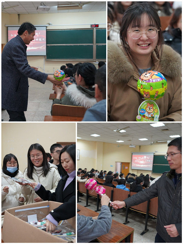 首先,陳海群對(duì)正在備戰(zhàn)考研的學(xué)子們表達(dá)了慰問(wèn)、鼓勵(lì)、期望之情:希望同學(xué)們保持樂(lè)觀的心態(tài)、注意身體健康、明確考研目標(biāo)、積極備戰(zhàn)考研。接著,吳荷平叮囑大家平衡好考研壓力,把生活、學(xué)習(xí)規(guī)律調(diào)整到位,全力沖刺,發(fā)揮出自己最好的水平。而后,繆老師通過(guò)“青春是用來(lái)拼搏的,夢(mèng)想是用來(lái)實(shí)現(xiàn)的,圓夢(mèng)考研你們是最棒的!”來(lái)鼓勵(lì)大家考研加油。院領(lǐng)導(dǎo)表示學(xué)院是所有考研同學(xué)的堅(jiān)強(qiáng)后盾,會(huì)努力為大家提供良好的考研條件,并祝愿大家金榜題名,考上理想院校。最后,學(xué)院還為考研學(xué)子們發(fā)放了“最棒”棒棒糖、“考霸”文具袋,希望同學(xué)們堅(jiān)定信念,全力沖刺,蟾宮折桂,舍我其誰(shuí)!