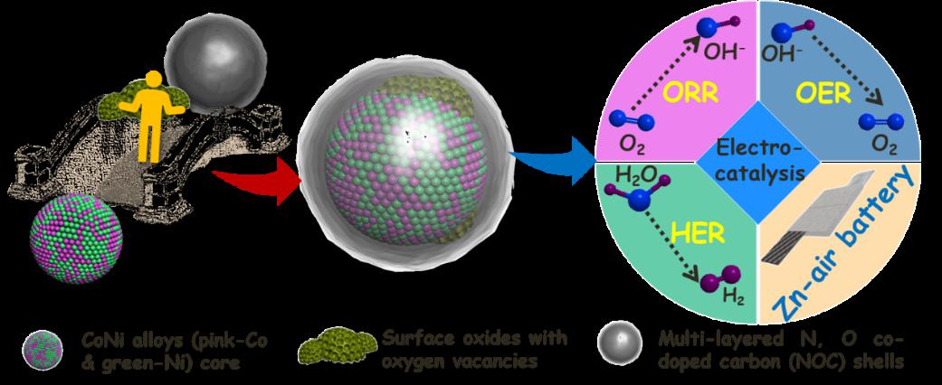 氧氣還原、氧氣析出以及氫氣析出等小分子電催化反應(yīng)是鋅空氣電池、鋰空氣電池、燃料電池以及電化學(xué)分解水制氫等能量存儲(chǔ)與轉(zhuǎn)換技術(shù)的核心反應(yīng),然而它們均是動(dòng)力學(xué)慢反應(yīng),都需要使用催化劑來加速它們的反應(yīng),從而提高存儲(chǔ)和轉(zhuǎn)換效率。在單一催化劑上實(shí)現(xiàn)多功能電催化一直是該領(lǐng)域研究的熱點(diǎn)和重點(diǎn),這對(duì)于降低上述能量存儲(chǔ)與轉(zhuǎn)換器件結(jié)構(gòu)的復(fù)雜性、大幅度提高性能,促進(jìn)它們的產(chǎn)業(yè)化都具有重要意義。銀鳳翔-陳標(biāo)華課題組的何小波副研究員利用CoNi-雙金屬有機(jī)骨架材料為前驅(qū)體,開發(fā)了一種“表面輕微氧化的CoNi 合金@氮/氧共摻雜碳”的多功能催化劑。這種多功能催化劑擁有媲美于貴金屬催化劑的氧氣還原、氧氣析出以及氫氣析出的高效電催化性能。更為突出的是,這種電催化劑使得鋅空氣電池?fù)碛?/span>98.6%的理論比容量和74.8%的理論能量密度,并且超過100小時(shí)運(yùn)行后鋅空氣電池的性能幾乎沒有衰減。深入的構(gòu)-效關(guān)系研究發(fā)現(xiàn),該催化劑中CoNi合金納米顆粒表面存在的少量氧化層起到了關(guān)鍵作用。這種關(guān)鍵作用主要體現(xiàn)在以下兩個(gè)方面:(一)少量氧化層“富含”氧空位,氧空位促進(jìn)了從CoNi合金納米顆粒(核心)到氮/氧共摻雜碳(外殼)的電子轉(zhuǎn)移,從而優(yōu)化了在電催化過程中起直接催化作用的氮/氧共摻雜碳中活性位的電子結(jié)構(gòu)及其對(duì)反應(yīng)物種的吸脫附能力,最終使得CoNi合金納米顆粒(核心)和氮/氧共摻雜碳(外殼)在多功能電催化過程中能夠分別“間接”與“直接”地貢獻(xiàn)各自的作用;(二)“富含”氧空位的少量氧化層還增強(qiáng)了催化劑的整體導(dǎo)電性,從而促進(jìn)了催化劑、電解液與氣態(tài)反應(yīng)物(產(chǎn)物)之間的三相界面電荷轉(zhuǎn)移,最終有利于加速多功能電催化反應(yīng)過程。