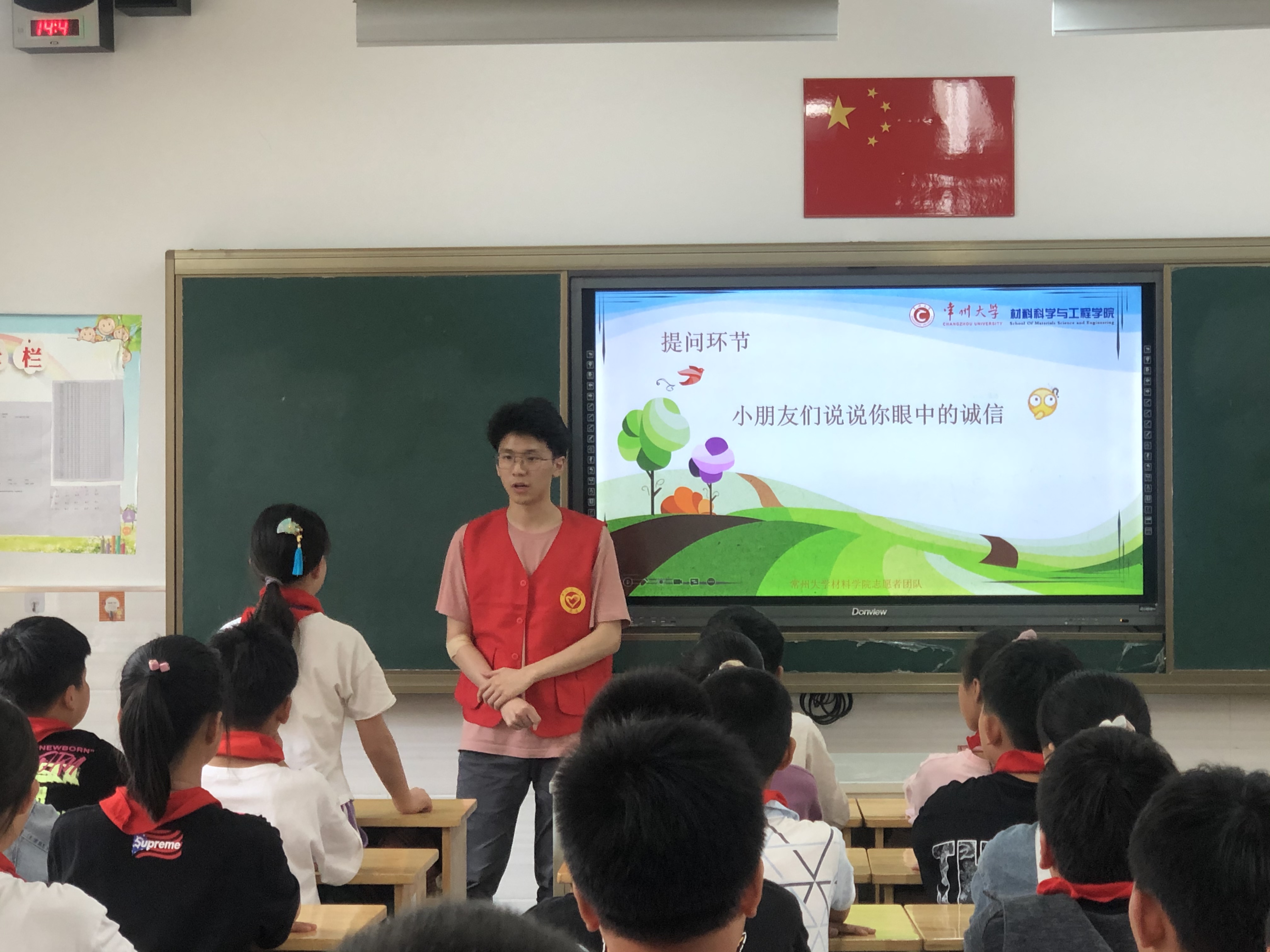 為宣傳紅色黨史、普及誠信教育,6月4日下午兩點(diǎn),常州大學(xué)石油化工學(xué)院食品學(xué)院與材料工程學(xué)院志愿者們?yōu)槿嗣衤沸W(xué)五年級(jí)(3)班的同學(xué)們開展“銘黨史、講誠信、守初心”志愿宣講活動(dòng),