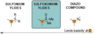 锍葉立德作為兩性離子化合物,一般需要在葉立德Cα-位引入吸電子基來穩(wěn)定其存在。此外,根據硫原子氧化態(tài)的不同,可以分為sulfonium ylide(正锍葉立德)與sulfoxonium ylide(氧化锍葉立德)兩大類。電負性氧原子的引入,不僅使得氧化锍葉立德的葉立德碳Lewis堿性降低,而且具Lewis堿性的氧原子或副產物DMSO容易與手性催化劑結合,從而可能對反應過程中的手性誘導產生干擾。但與正锍葉立德以及類似的重氮化合物相比,氧化锍葉立德具有良好的穩(wěn)定性,之前報道的絕大多數文獻都將其作為重氮化合物的替代物經金屬卡賓中間體應用于有機合成。因此,發(fā)展基于锍葉立德不對稱催化研究具有重要意義。