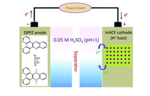 A rocking-chair aqueous proton battery is assembled by using dipyridophenazine and indium hexacyanoferrate as the anode and cathode materials, respectively. The reversible amination of redox-active phenazine moieties in dipyridophenazine and fast intercalation–deintercalation of protons in hexacyanoferrate enable the aqueous proton battery to achieve a reversible specific capacity of 37 mA h g?1 at 1 A g?1, good cycling stability with 76.1% capacity retention over 3000 cycles and excellent rate capability.