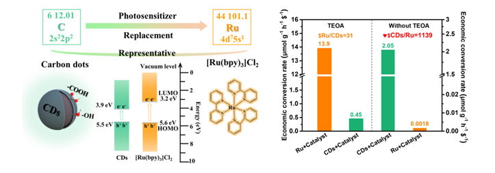 課題組基于MOFs材料構(gòu)建“多核殼催化劑”,由ZIF-67@MIL-68(In)誘導(dǎo)生成CDs/Co3O4/In2O3納米管。研究發(fā)現(xiàn),CDs(碳點(diǎn))基催化劑在不添加犧牲劑TEOA(三乙醇胺)的條件下,光催化CO2還原性能優(yōu)于吡啶釕基催化劑。在這一體系中,碳點(diǎn)可以有效替代貴金屬催化劑取得良好的光催化性能。此項(xiàng)研究得到了江蘇省優(yōu)秀青年基金,國(guó)家自然科學(xué)基金的支持。
