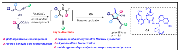 我們發(fā)展了一種金屬-有機(jī)接力催化策略即:金屬銠催化重氮和烯炔醇經(jīng)過(guò)串聯(lián)重排反應(yīng)得到烯炔二酮(enyne diketones), 烯炔二酮作為新穎的Nazarov反應(yīng)底物在手性催化劑的催化下,高對(duì)映和非對(duì)映選擇性制備一系列手性聯(lián)烯環(huán)戊烯酮。