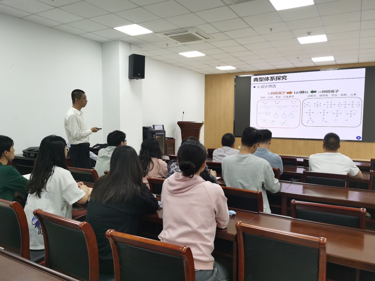 戚律老師作了“過程強(qiáng)化視角下典型化工分離體系探究”的報(bào)告,他于2021年4月-2022年3月在上海交通大學(xué)羅正鴻教授聚合反應(yīng)工程實(shí)驗(yàn)室訪學(xué),報(bào)告會(huì)上,戚老師介紹了他近幾年在化工分離領(lǐng)域基于離子液體所做的多尺度過程強(qiáng)化研究,和大家探討了化工學(xué)科做研究的心得體會(huì)。
