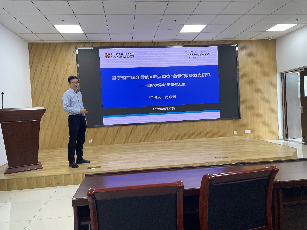 肖唐鑫老師作了“葫蘆脲介導(dǎo)的AIE型單體首步聚集發(fā)光研究”的報(bào)告,他于2021年3月-2022年6月受?chē)?guó)家留學(xué)基金委資助赴英國(guó)劍橋大學(xué)化學(xué)系研修。在報(bào)告中,肖老師介紹了訪(fǎng)學(xué)的申請(qǐng)過(guò)程、訪(fǎng)問(wèn)期間的學(xué)術(shù)研究?jī)?nèi)容,還和大家分享了在劍橋的見(jiàn)聞。