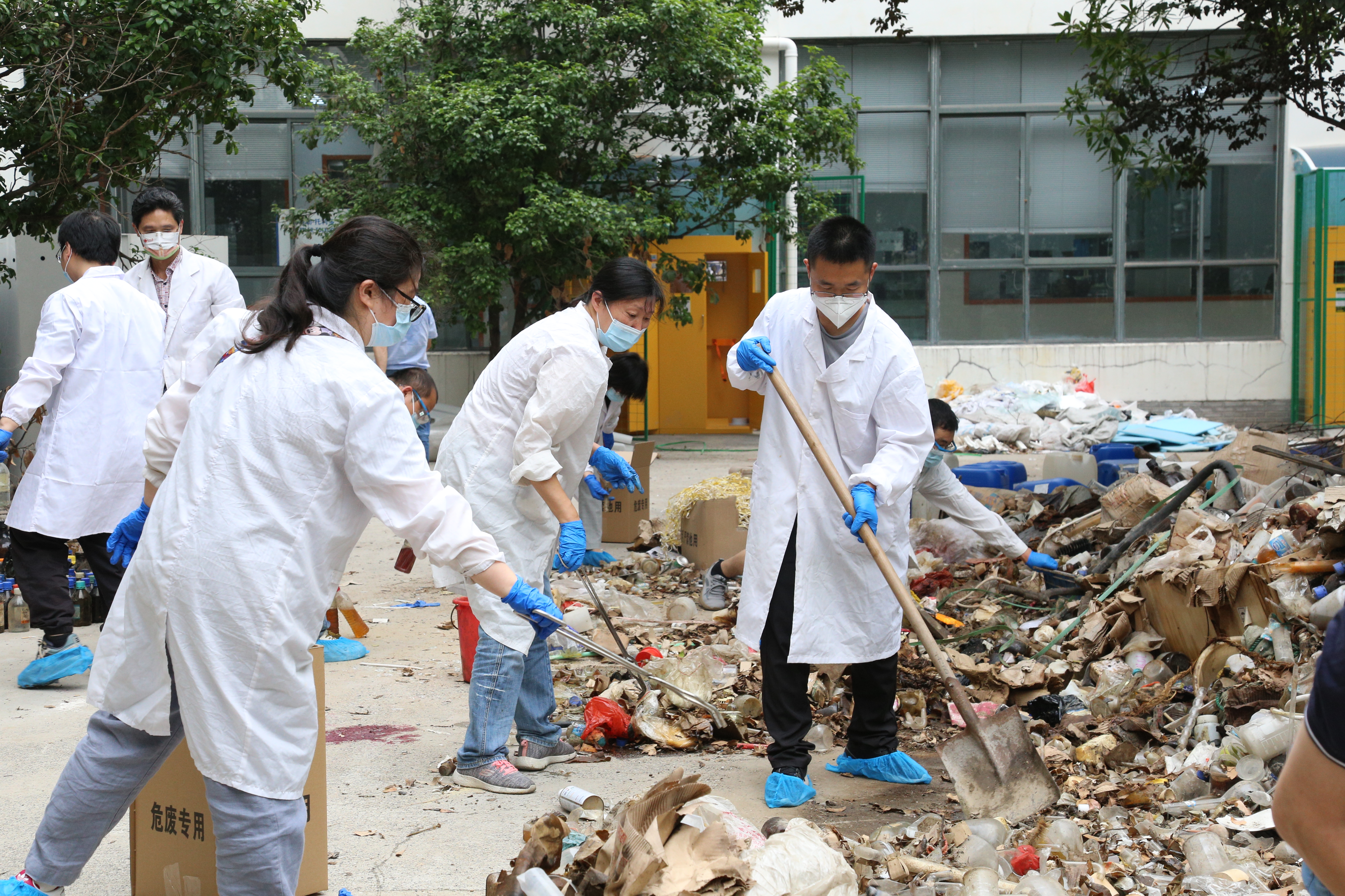 知行樓改造工程過程中清理出的化工廢棄物被堆積在小院西南及西北角造成安全隱患,由分工會發(fā)起,在全體有化工相關(guān)知識的老師中招募志愿者,組織突擊隊對這些化工廢棄物進行專業(yè)處理,很多黨員主動請纓,加入到了化工垃圾清零行動中。