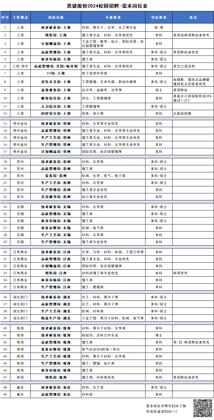 上海恩捷新材料科技股份有限公司是全球領(lǐng)先的鋰電池隔膜行業(yè)龍頭企業(yè),22年鋰電池隔膜全球市場占有率46%。新能源行業(yè),24年校招崗位200+,工作地點(diǎn)覆蓋上海、常州、無錫、蘇州、江西、湖北、重慶、珠海、匈牙利、美國等,恩捷希望優(yōu)先從常州大學(xué)引進(jìn)化工、能源、化學(xué)、材料等專業(yè)優(yōu)秀的本科、碩士、博士人才!簡歷投遞郵箱:recruiter@semcorpglobal.com。