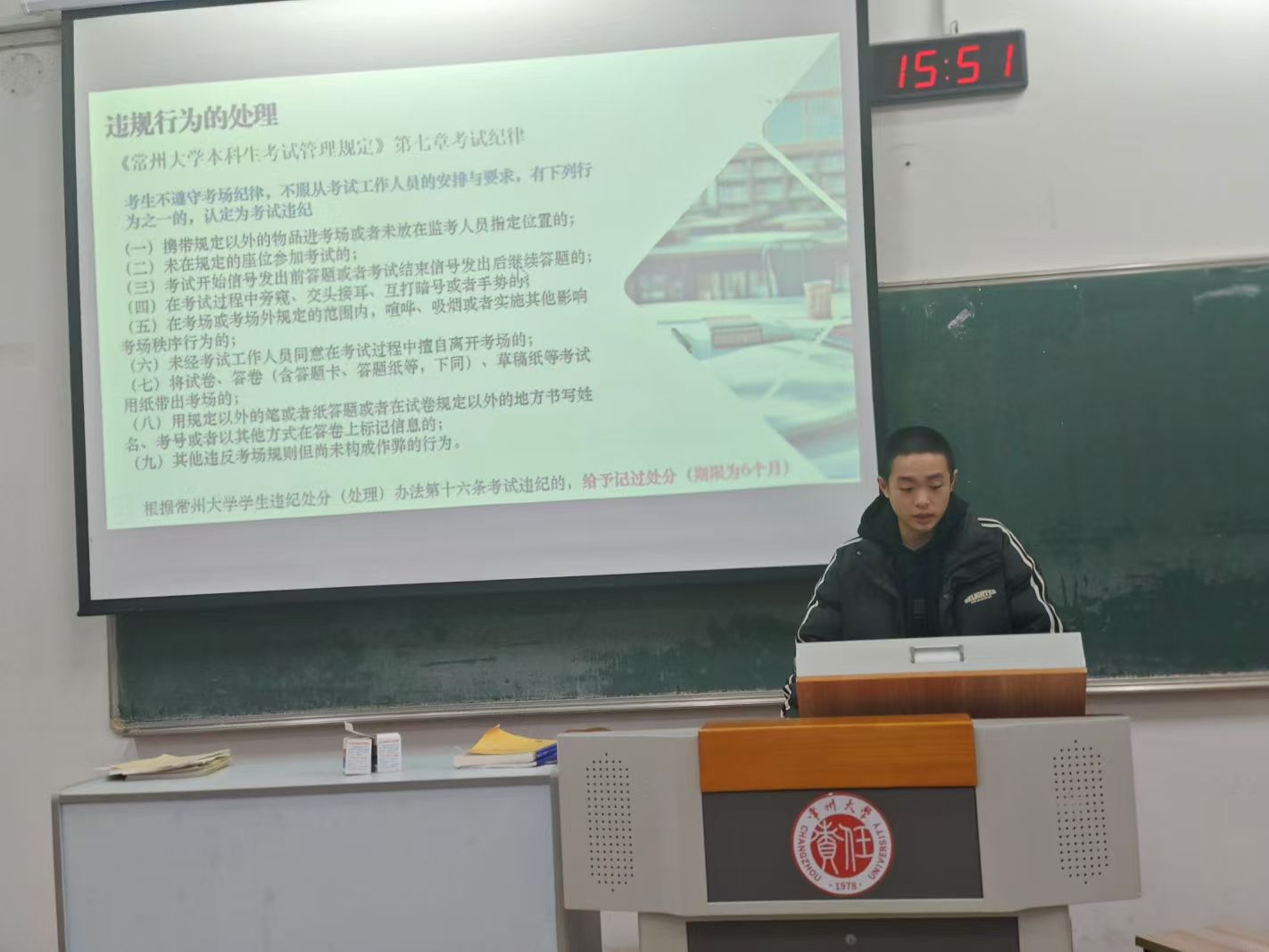 各班班會主講人帶領班級同學系統(tǒng)學習了《國家教育考試違規(guī)處理辦法》、《常州大學本科生考試管理規(guī)定》以及《常州大學學生違紀處分(處理)辦法》,并結合數(shù)起考試作弊案例闡述了誠信的重要性,以及因誠信缺失所帶來的嚴重后果,警示同學們在考試過程中必須堅守誠信原則,要嚴格遵守各項規(guī)章制度。班會最后,各班班長帶領班級同學簽下誠信考試承諾書,同學們莊重承諾,會以誠實守信的態(tài)度對待每一場考試,展現(xiàn)出優(yōu)良的考風考紀。