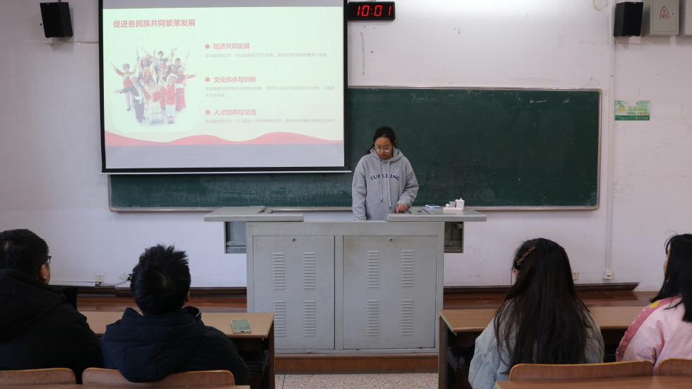 為了促進(jìn)各民族的團(tuán)結(jié)友愛、構(gòu)建和諧美好的民族大家庭,我院于12月29日在W1202教室開展了主題為“民族團(tuán)結(jié)一家親,同心共筑中國夢(mèng)”的宣講活動(dòng)。宣講會(huì)上,謝露深入淺出地圍繞民族團(tuán)結(jié)的關(guān)鍵意義、中國夢(mèng)的豐富內(nèi)涵與意義、民族團(tuán)結(jié)與中國夢(mèng)之間的緊密聯(lián)系以及青少年踐行方式四個(gè)核心維度,帶領(lǐng)大家深入解讀中國夢(mèng)和民族團(tuán)結(jié)的關(guān)系。朱一飛與各位同學(xué)交流了各民族風(fēng)俗,宣傳了宗教與教育相分離原則。通過本次宣講活動(dòng),同學(xué)們對(duì)民族團(tuán)結(jié)和中國夢(mèng)有了更深的理解和感悟,同時(shí)也激發(fā)了他們的責(zé)任感與使命感。