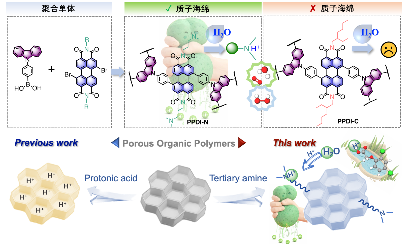 光催化生產過氧化氫(H2O2)過程中,主導催化效率的氧還原反應(ORR)所需的質子(H+)僅來自于水氧化反應(WOR),但WOR動力學卻遠弱于ORR。因此,如何加速WOR產生更多H+,以滿足ORR的動力學需求,是提升光催化產H2O2速率的關鍵。近日,顧培洋教授團隊和李忠玉教授團隊合作,提出了“質子海綿”這一概念(圖1),基于苝酰亞胺,制備了一種二甲氨基修飾的共軛微孔聚合物(CMPs)催化材料,在該領域取得重要進展: