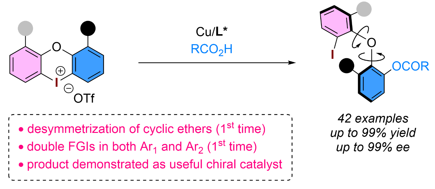 高效構建軸向手性二芳基醚(ACDEs)是有機合成中一項重要且新興但極具挑戰(zhàn)性的任務?,F(xiàn)有基于去對稱化策略的成功案例僅限于非環(huán)芳基醚,且僅能對四個取代基中的一個進行單一修飾,模塊化程度較低。黃海和孫建偉課題組近日首次開發(fā)了一種雙取代基同步修飾的對映選擇性合成策略,實現(xiàn)了ACDEs結構的靈活多樣化構建。基于環(huán)狀二芳基碘鎓鹽的開環(huán)反應,建立了一種溫和的銅催化方法,在溫和條件下實現(xiàn)了優(yōu)異的反應效率、對映選擇性和良好的區(qū)域選擇性。所獲得的高對映體純度ACDEs產(chǎn)物可作為高效手性催化劑應用于不對稱合成領域。