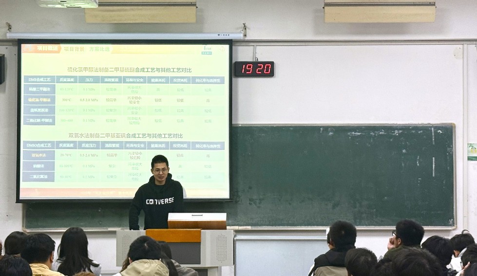 為幫助同學(xué)們拓寬專業(yè)視野、提升專業(yè)實(shí)踐能力,11月11日晚,“石化青年說”系列講座第二講在W1207教室順利舉行,講座由化工224班常佩源與化工226班張皓博兩位同學(xué)擔(dān)任主講。他們所在的常州大學(xué)“砜硫隊(duì)”,曾憑借“福建凱美特氣體有限公司分公司年產(chǎn)1.5萬噸二甲基亞砜項(xiàng)目”的出色設(shè)計(jì),在2025年“天正設(shè)計(jì)杯”第十九屆全國大學(xué)生化工設(shè)計(jì)競賽中脫穎而出,斬獲全國特等獎。