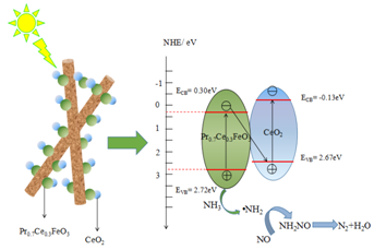 Rational construction of direct Z-scheme doped perovskite/palygorskitenanocatalyst for photo-SCR removal of NO: Insight into the effect of Ceincorporation Xiazhang Li *, Haiyang Shi , Xiangyu Yan , ShixiangZuo , Yuying Zhang , Qun Chen , Chao Yao *,Chaoying Ni*,Journal of Catalysis 369 (2019) 190–200 原文鏈接: https://www.sciencedirect.com/science/article/pii/S0021951718304391?dgcid=author 針對(duì)脫硝催化劑低溫活性差,抗硫抗水性弱,成本高的難題,本團(tuán)隊(duì)近年來(lái)嘗試將光驅(qū)動(dòng)引入傳統(tǒng)SCR催化脫硝體系,基于“固溶析出相”的理念,以天然凹凸棒石(坡縷石)為基體,相繼設(shè)計(jì)了Mn離子摻雜type-I型(ChemicalEngineeringJournal, 2017, 320, 211-221),Ni離子摻雜type-II型photo-SCR催化劑(Applied Catalysis B: Environmental,2018,231, 92–100),巧妙解決了光生載流子易復(fù)合的難題,并構(gòu)建了石墨烯介質(zhì)的間接Z-Scheme(Journal of Catalysis,2018,357,59–68),氮摻雜碳量子點(diǎn)修飾的直接Z-Scheme催化劑(ACS Sustainable Chem. Eng, 2018, 6,6, 10616?10627),解決了光生電荷遷移后氧化還原活性變差的難題。本工作在此基礎(chǔ)上,在鈣鈦礦中引入Ce離子,通過(guò)費(fèi)米能級(jí)的調(diào)控引導(dǎo)在凹凸棒石表面形成摻雜PrFeO3/CeO2直接Z-Scheme“固溶析出相”異質(zhì)結(jié),無(wú)須傳導(dǎo)介質(zhì),有效提升了光能吸收,保持了高氧化還原活性的同時(shí)表現(xiàn)出良好的低溫抗硫抗水性。該工作得到了國(guó)家自然科學(xué)基金(51674043)和江蘇省國(guó)際科技合作項(xiàng)目(BZ2015040)的資助,同時(shí)得到了美國(guó)特拉華大學(xué)電鏡中心主任倪超英教授的大力支持。