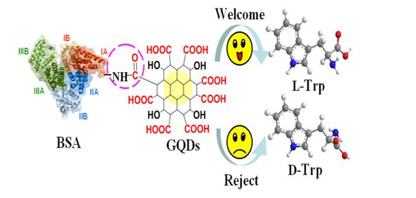 Covalent Functionalization of Bovine Serum Albumin with Graphene Quantum Dots for Stereospecific Molecular RecognitionQiumin Ye, Lili Guo, Datong Wu, Baozhu Yang, Yongxin Tao, Linhong Deng, Yong Kong* 原文鏈接:https://pubs.acs.org/doi/10.1021/acs.analchem.9b02605 牛血清白蛋白(BSA)是一種研究廣泛的血清蛋白,因其具有易溶、成本低、生物相容性高等優(yōu)點(diǎn)已引起研究者的廣泛關(guān)注。近日,課題組制備了BSA 與石墨烯量子點(diǎn)(GQDs)的復(fù)合材料,并將其成功應(yīng)用于色氨酸(Trp)對(duì)映體的電化學(xué)識(shí)別。GQDs與BSA之間的酰胺化反應(yīng)形成的酰胺鍵破壞了BSA原有的規(guī)整形貌,改變了BSA整體肽鏈的空間構(gòu)型,使BSA分子原本的三維心形結(jié)構(gòu)得以擴(kuò)展,從而使肽鏈上的手性中心更易于暴露,提高了BSA-GQDs復(fù)合物的識(shí)別效率。