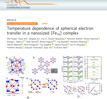 近日,我校石油化工學(xué)院吳大雨教授團(tuán)隊(duì)在合成和表征新型無(wú)機(jī)納米團(tuán)簇及其電子行為研究方面取得重要進(jìn)展,在Nature Communications(自然通訊)發(fā)表了題為“Temperature dependence of spherical electron transfer in a nanosized [Fe14] complex”(DOI: 10.1038/s41467-019-13279-y)的原創(chuàng)性論文(文章鏈接:https://www.nature.com/articles/s41467-019-13279-y)。Nature Communications期刊是Nature出版集團(tuán)旗下的國(guó)際頂級(jí)綜合性學(xué)術(shù)期刊,該項(xiàng)成果以常州大學(xué)為第一署名單位。近年來(lái),吳大雨教授課題組致力于分子基材料跨學(xué)科研究,所涉及的學(xué)科方向包括化學(xué)、材料學(xué)、物理學(xué)與光電子等。該項(xiàng)工作應(yīng)用金屬-有機(jī)自組裝策略,合成了高核鐵原子納米團(tuán)簇,通過(guò)精準(zhǔn)調(diào)控團(tuán)簇表面的自由電子觀察分子水平上多電子轉(zhuǎn)移,顯示出分子基材料在電子轉(zhuǎn)移活性催化材料、單分子磁體、高密度信息存儲(chǔ)等領(lǐng)域的巨大應(yīng)用潛力。其亮點(diǎn)不僅在于成功合成氰橋高核鐵納米團(tuán)簇,同時(shí)結(jié)合多種表征方法和理論計(jì)算清晰表征團(tuán)簇球殼表面的電子轉(zhuǎn)移活性位點(diǎn),其作為電子化合物屬性是一類(lèi)具有特殊性能的量子材料,其中過(guò)剩電子被限域在團(tuán)簇殼層表面并充當(dāng)陰離子,對(duì)電子傳輸和材料的催化、電磁等性能起關(guān)鍵作用。